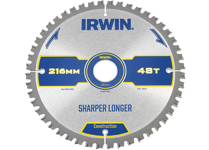 IRWIN Construction Mitre Circular Saw Blade 216 X 30Mm X 48T Atb/Neg M