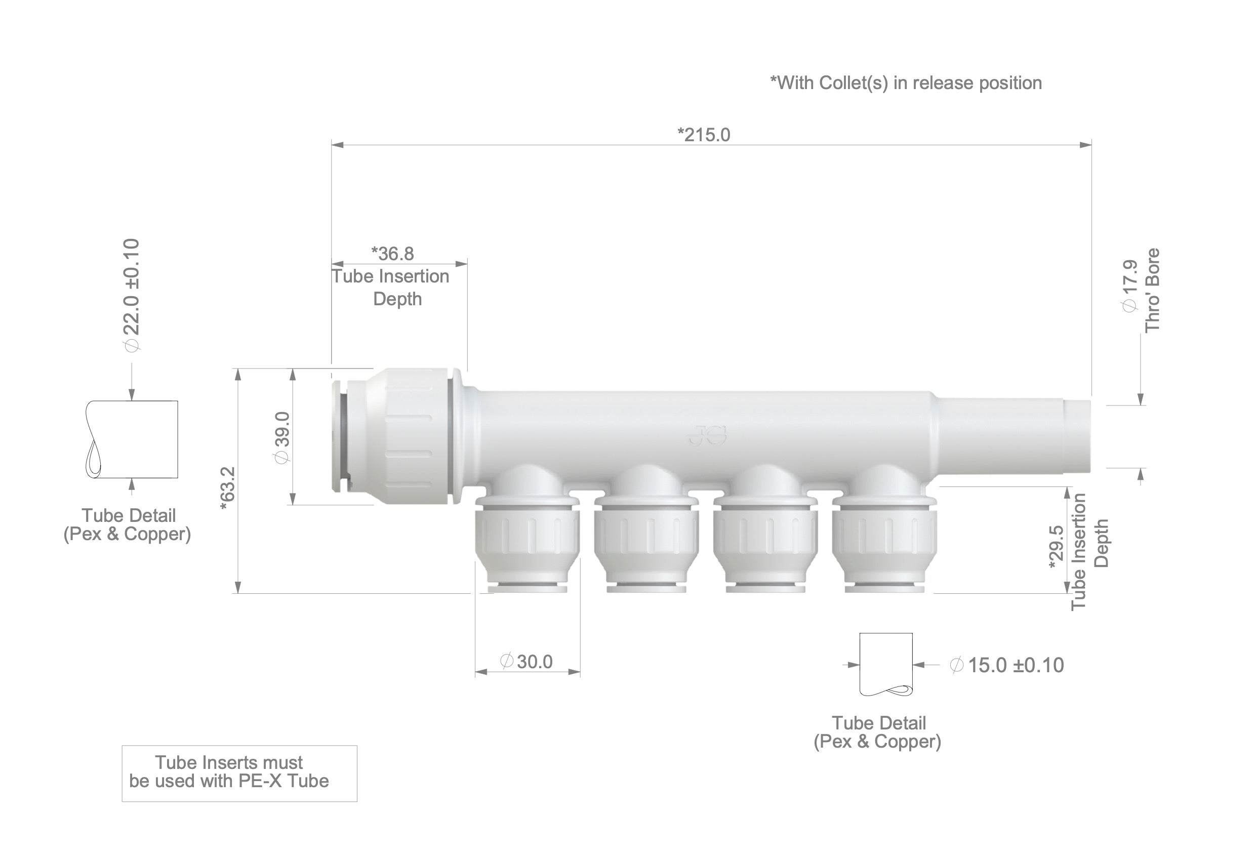 John Guest Speedfit 22mm x 15mm 4 Port Manifold With Stem PEM582215CW
