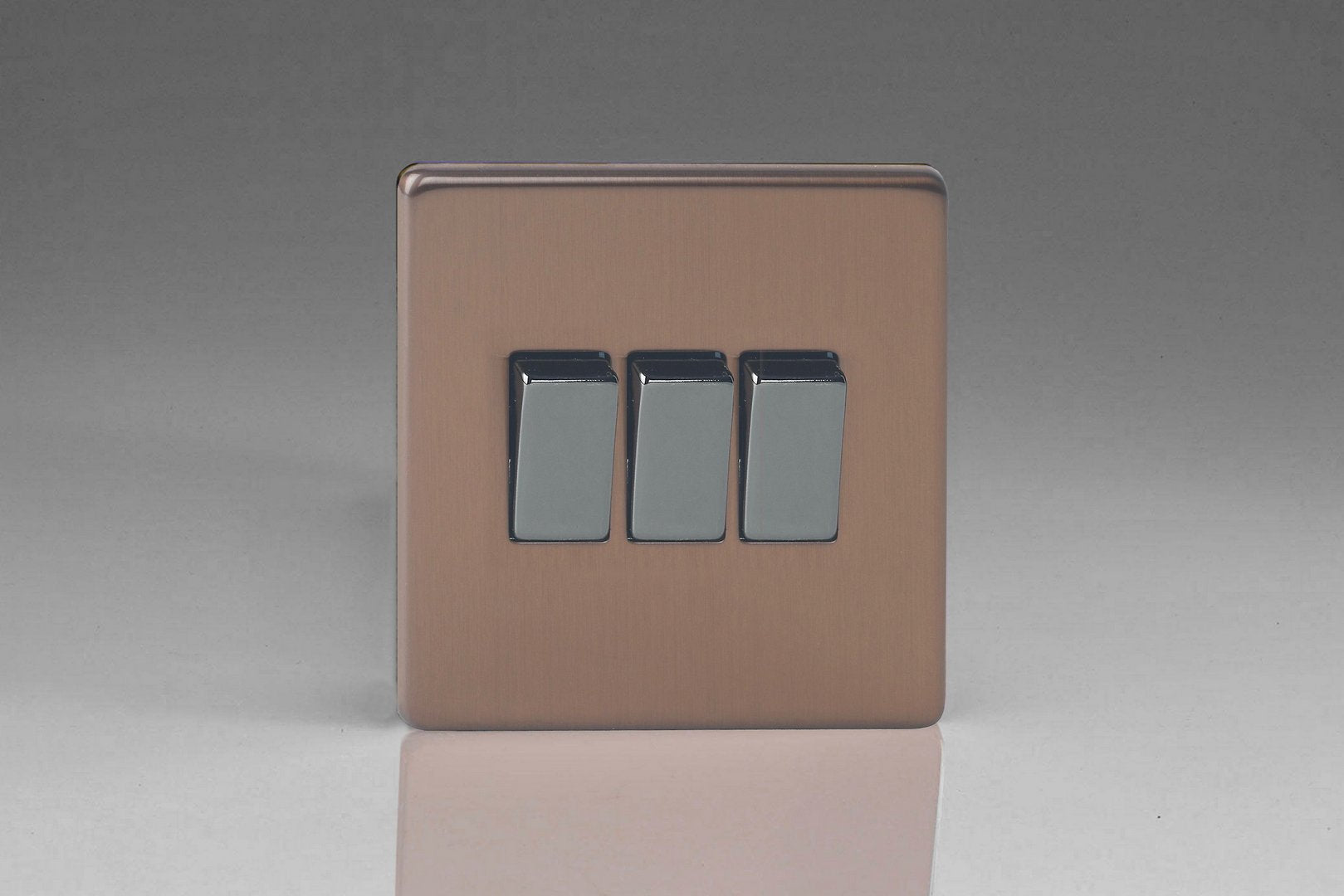 Varilight Flat Plate Screwless Brushed Bronze 3 Gang 2-Way 10 Amp Light Switch
