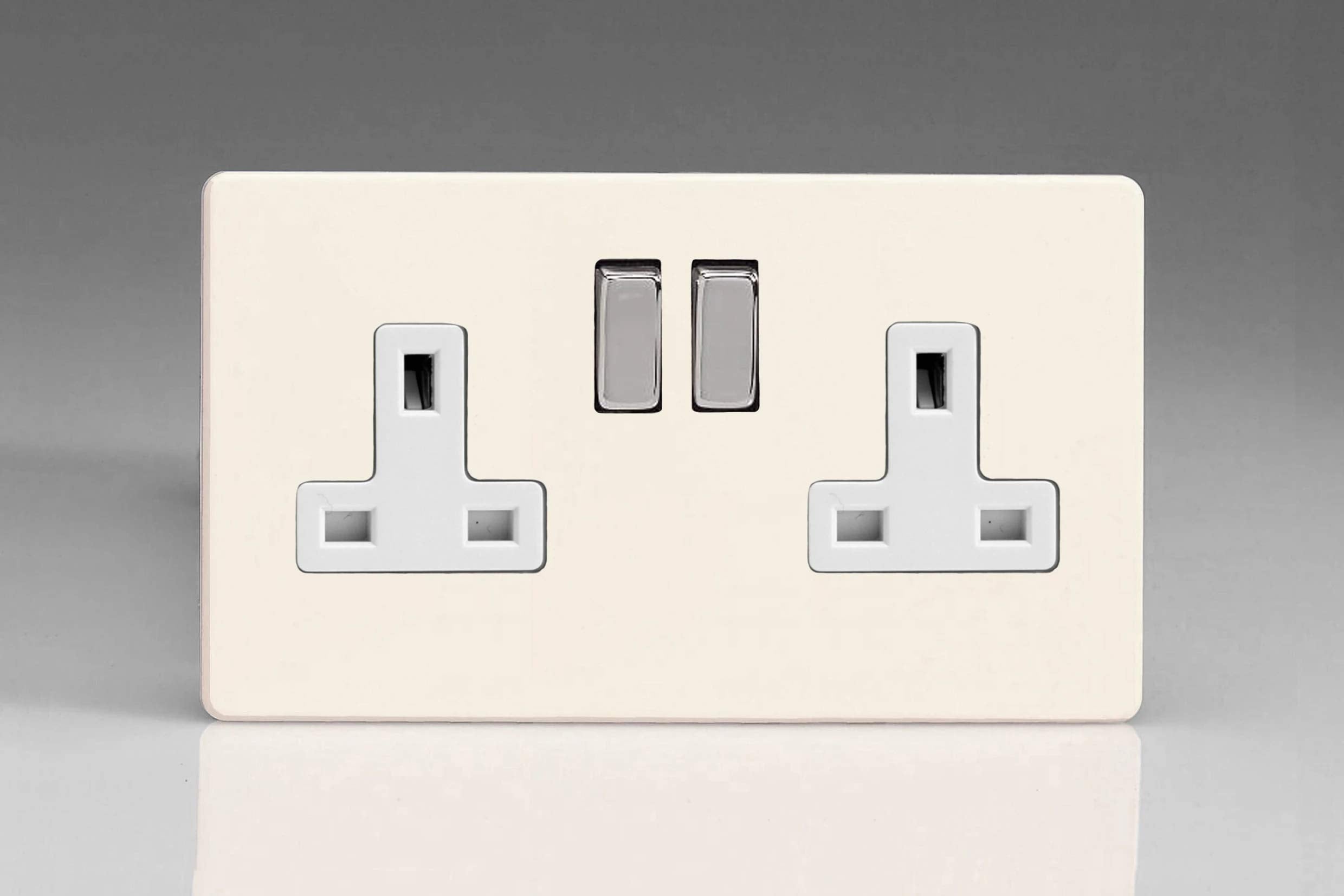 Varilight Primed Ready to Paint Flat Plate Screwless 2-Gang 13 Amp Switched Plug Socket White Inserts