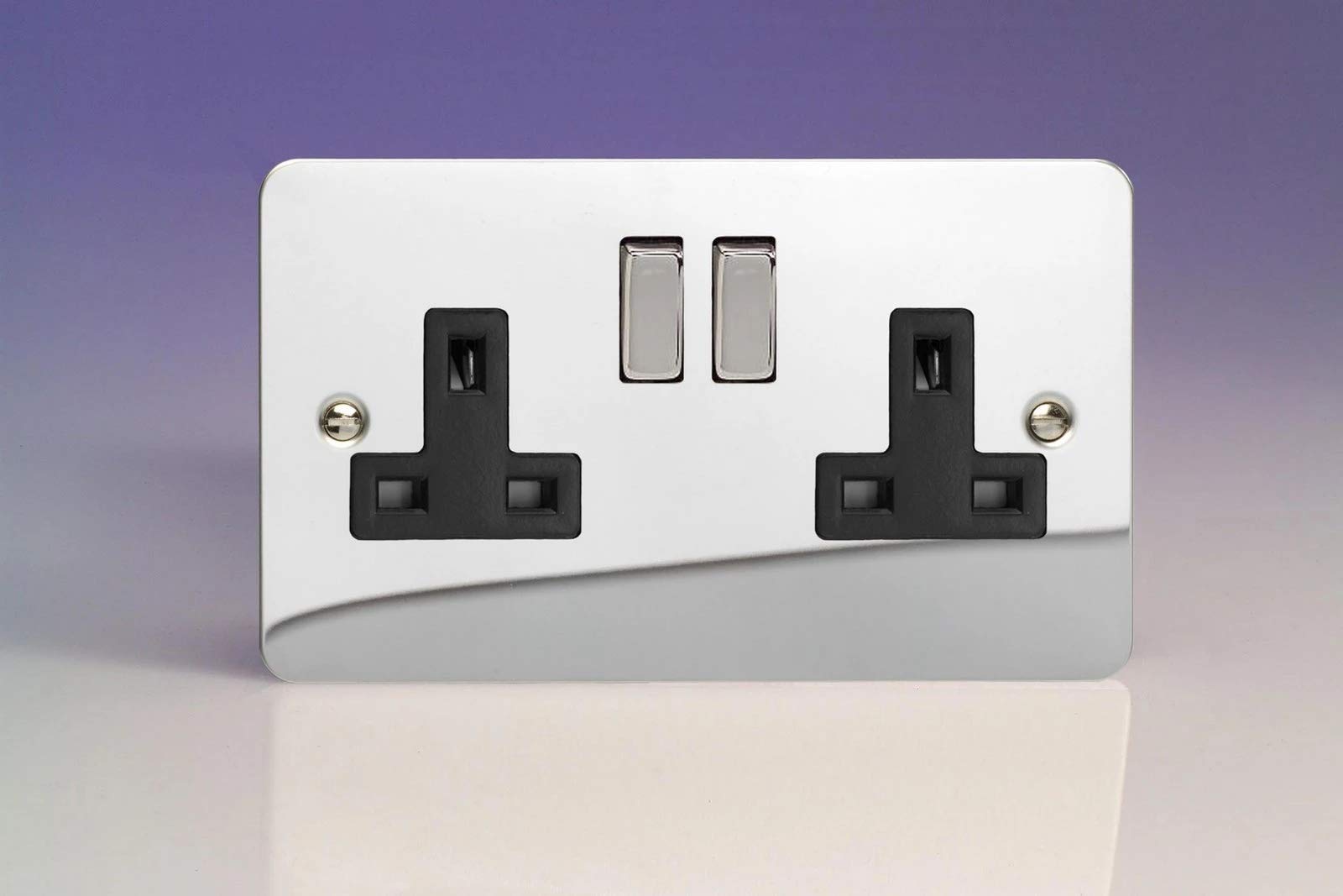 Varilight Ultra Flat Plate Polished Chrome Black & Metal Inserts 2-Gang 13Amp Plug Socket XFC5DB